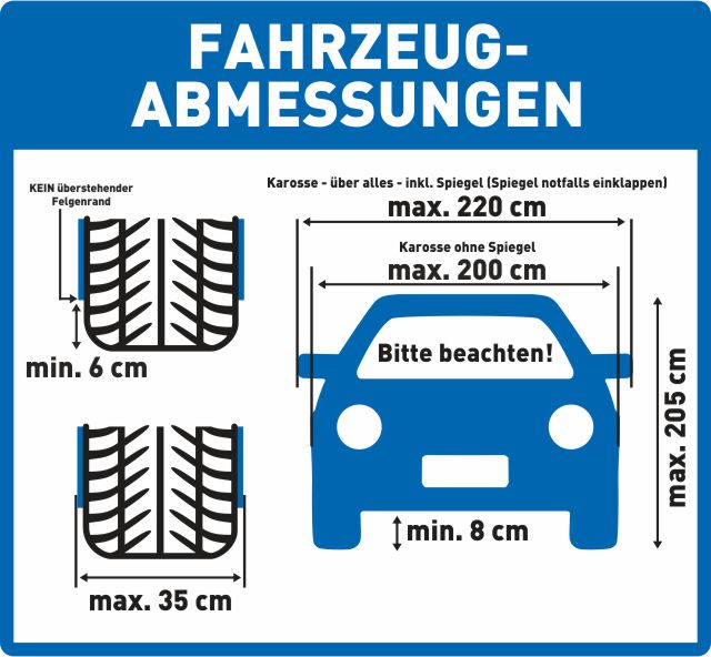 - Antenne vollständig einschieben oder abnehmen, Außenspiegel einklappen, Tankklappen, Kofferraum etc. sicher verschließen, Dachaufbauten und zusätzliche An- und Aufbauten entfernen, Fahrzeuge mit offener Ladefläche (z.B. Pickup, etc.) bitte beim Kassenpersonal melden.